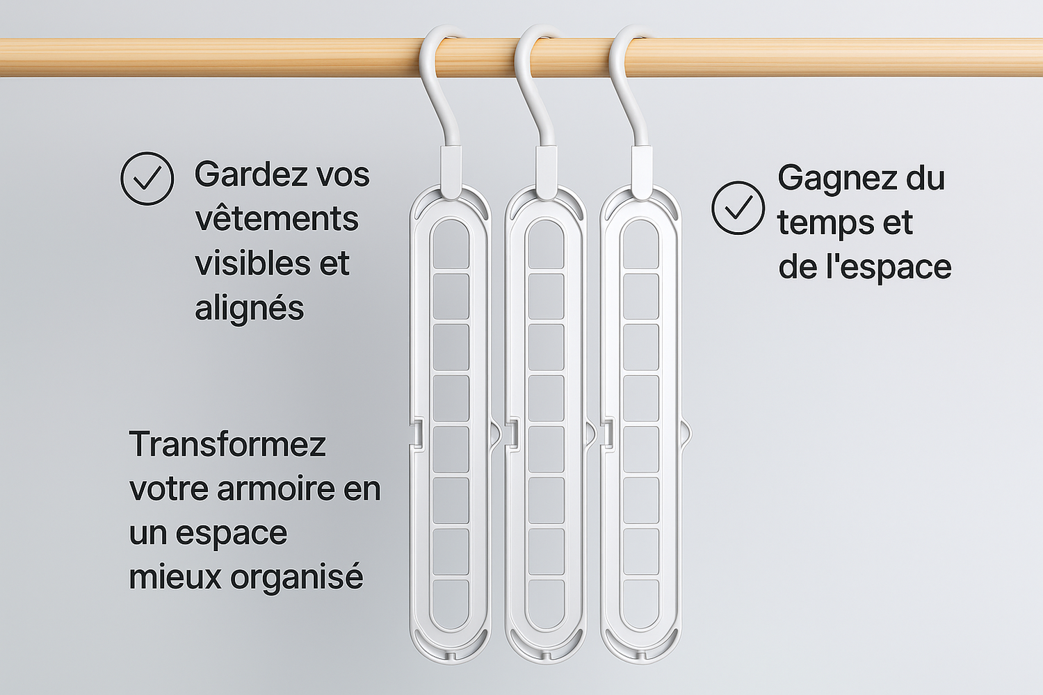 Gardez vos vêtements visibles et votre dressing parfaitement organisé ! Nos cintres pliables transforment votre espace, vous faisant gagner du temps et libérer de la place. Fini le désordre et la recherche interminable : chaque cintre simplifie votre quotidien et optimise votre rangement en un geste.
