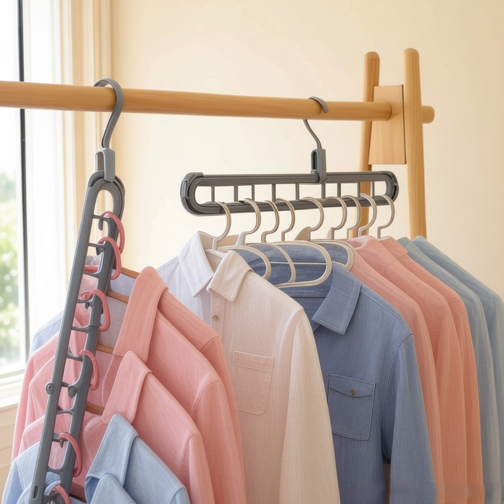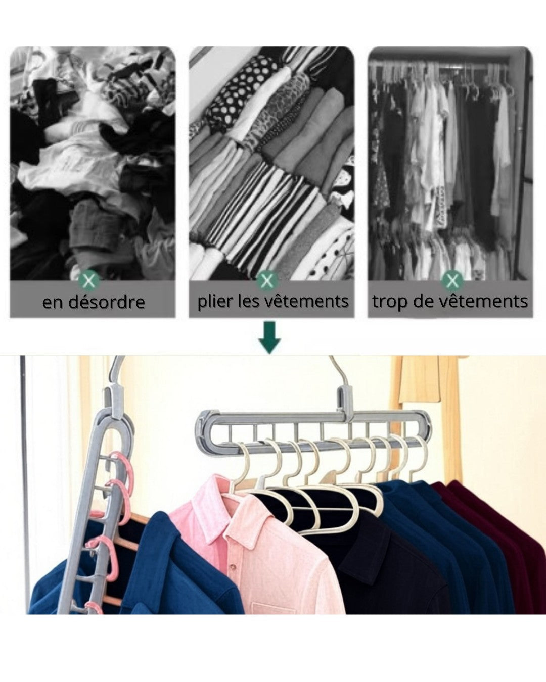 Gardez vos vêtements visibles et votre dressing parfaitement organisé ! Nos cintres pliables transforment votre espace, vous faisant gagner du temps et libérer de la place. Fini le désordre et la recherche interminable : chaque cintre simplifie votre quotidien et optimise votre rangement en un geste.